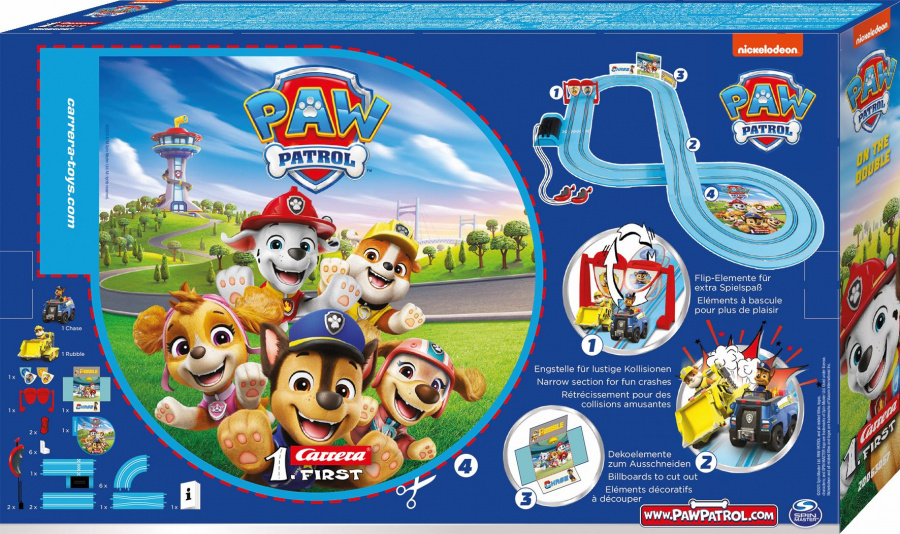 Autodráha Carrera FIRST dlouhá 2,9m s auty Tlapková Patrola Chase a Rubble, pro děti od 3 let, na baterie, obsahuje rovinky, zatáčky, bránu pro větší zábavu při jízdě, ovladače a dekorace s tématikou Tlapková Patrola