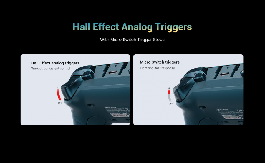 Plynulé a přesné analogové ovládání s možností přepnout na klikavé dorazy dle preference. Aktivuj režim Hair Trigger držením M + LT/RT. Pro maximální kontrolu i rychlost.